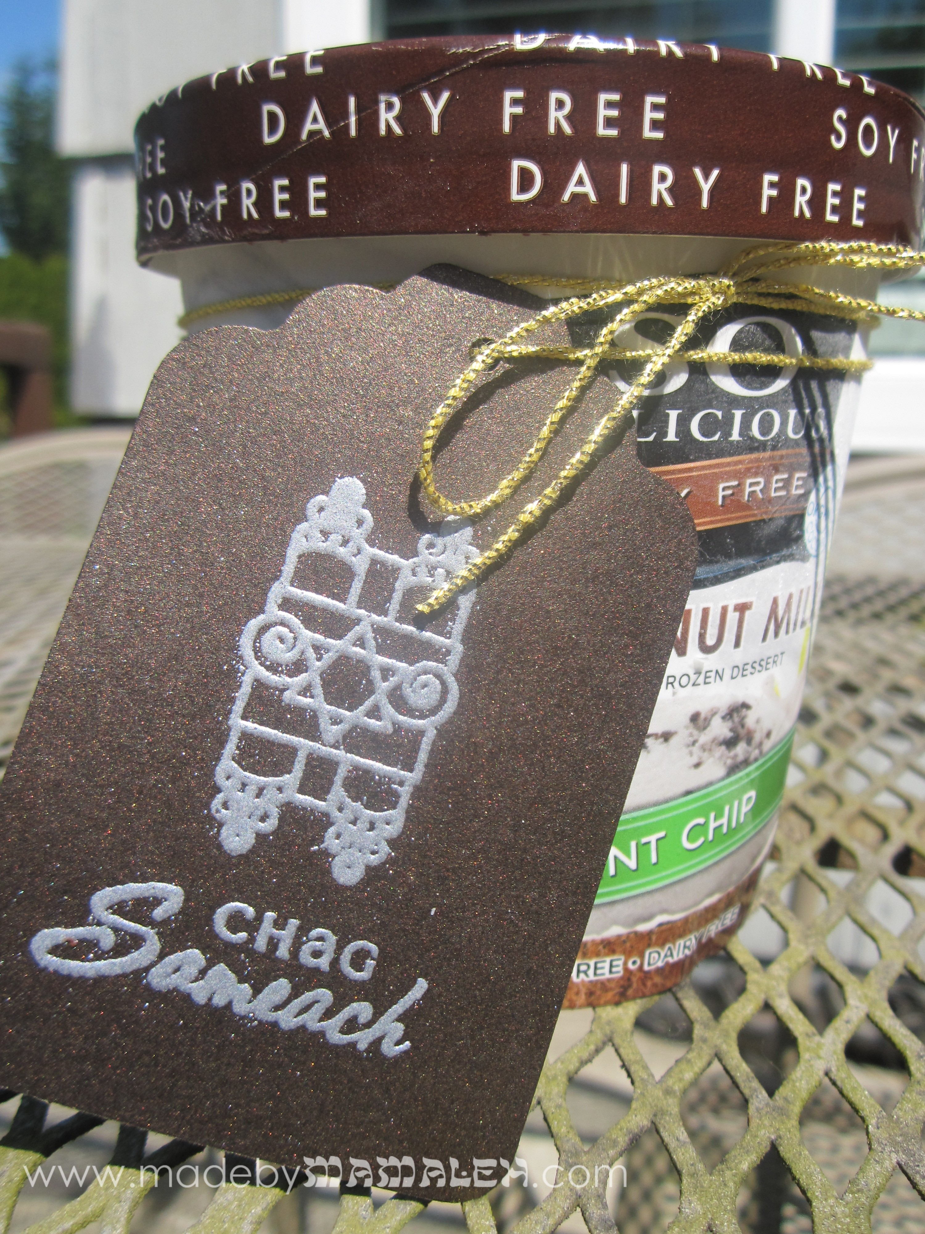 Chag Sameach! I thought I’d whip up a cute little tag in honor of Shavuot which begins Saturday night at sunset. Shavuot commemorates the giving of the Torah to Moses at Mt. Sinai. Among all of the customs associated with the holiday, it is traditional to eat dairy foods which isn’t really working for me now that I am lactose intolerant. So, I thought even better, I’d attach my tag to a nice pint of coconut milk ice cream.