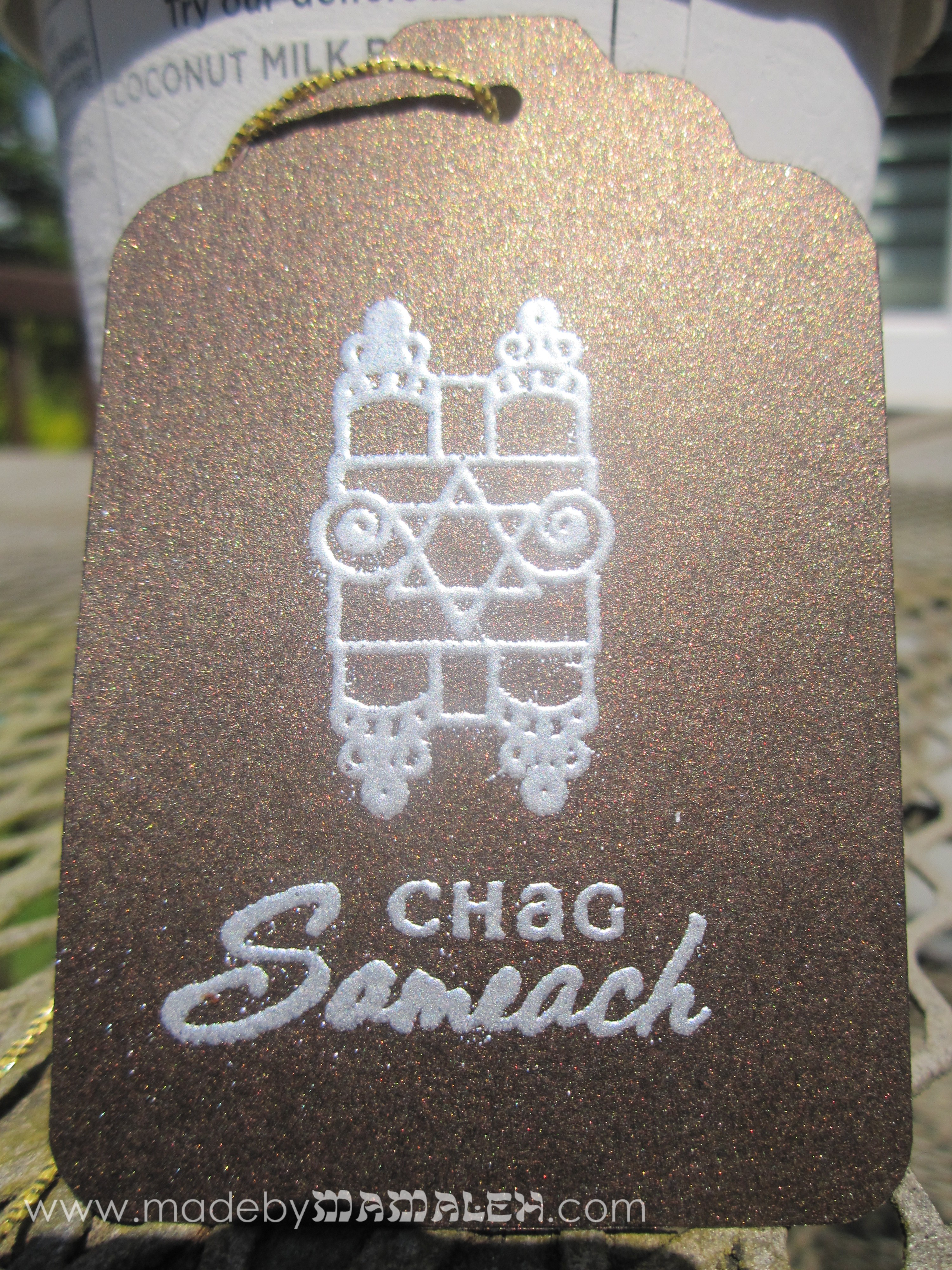 For the tag, I used some Stardream paper (sorry, I don’t remember the color, think it’s the bronze), punched out the tag using a punch, stamped the Torah and sentiment using a watermark pad (the Torah is from Paper Trey Ink Mazel Tov Stamp Set – one of the best Jewish sets out there; “Chag Sameach” (which translates to “joyous festival!”) sentiment from the Paper Trey Mazel Tov Additions set). After stamping them, I embossed them using some pearl embossing powder. I love how the combo turned out!