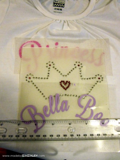 Next I cut the word “Princess” out of pink glitter heat transfer using Silhouette Studio and the font Lavanderia Sturdy. I went with the lighter Lavanderia Regular and Lilac vinyl for the princess’ name. Then, I laid everything out on the shirt using a clear ruler to get things just so.