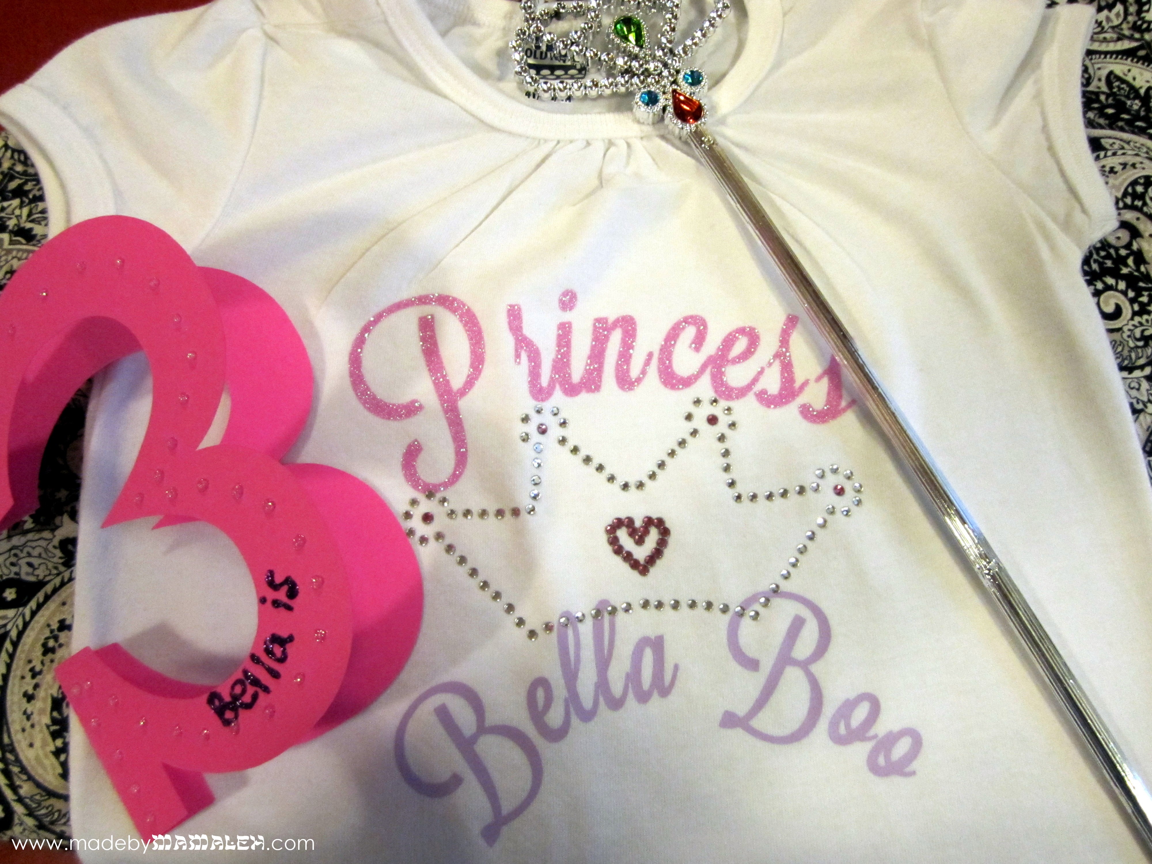 We had another 3rd birthday party to go to this past weekend, a princess themed one to be exact. So, I thought I’d use it as a chance to have a little more fun with T-shirt vinyl and rhinestones and make the birthday girl her own, very personalized tee.