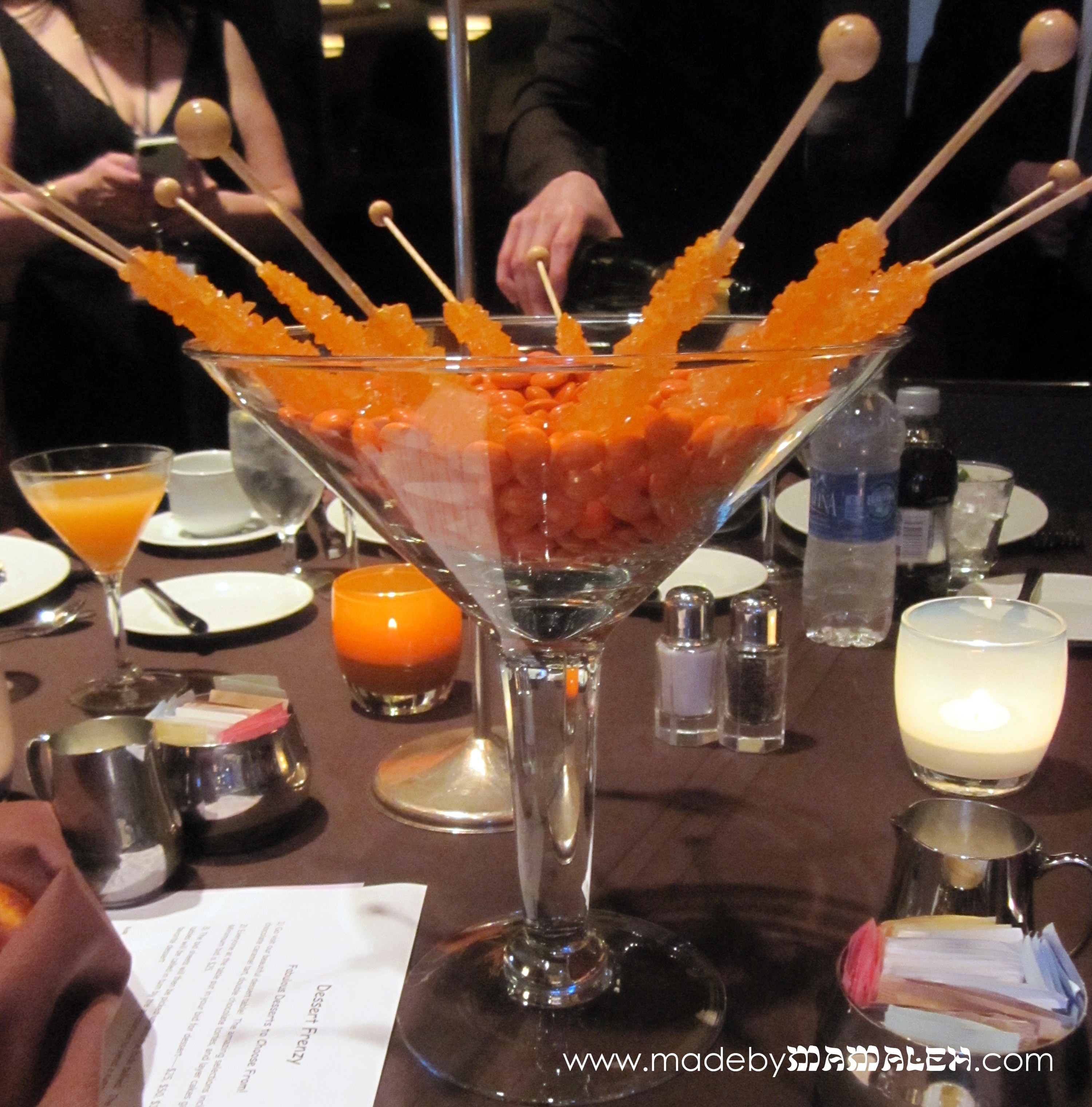 The centerpiece looks great. Chocolate and orange is always a winner.
