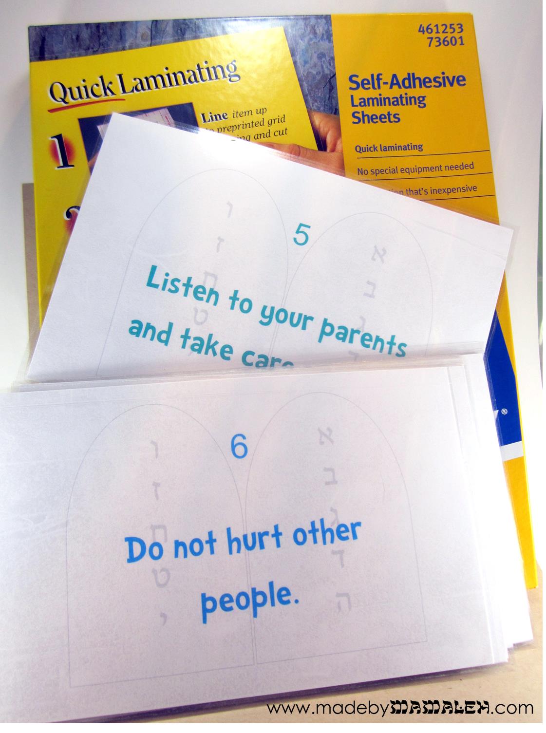 After the passports were done, I printed the commandment clues on cardstock as well. They are an 8 1/2×11 design but can easily be shrunk to print two per page as I did to make them a bit more manageable and difficult to find (you just need to change your PDF print settings – select “multiple”, 2 per sheet and landscape mode). Once the clues were cut to the right size, I decided to laminate them with self-adhesive laminating sheets so they can be used easily for years to come and stand up to any wear and tear from little hands.