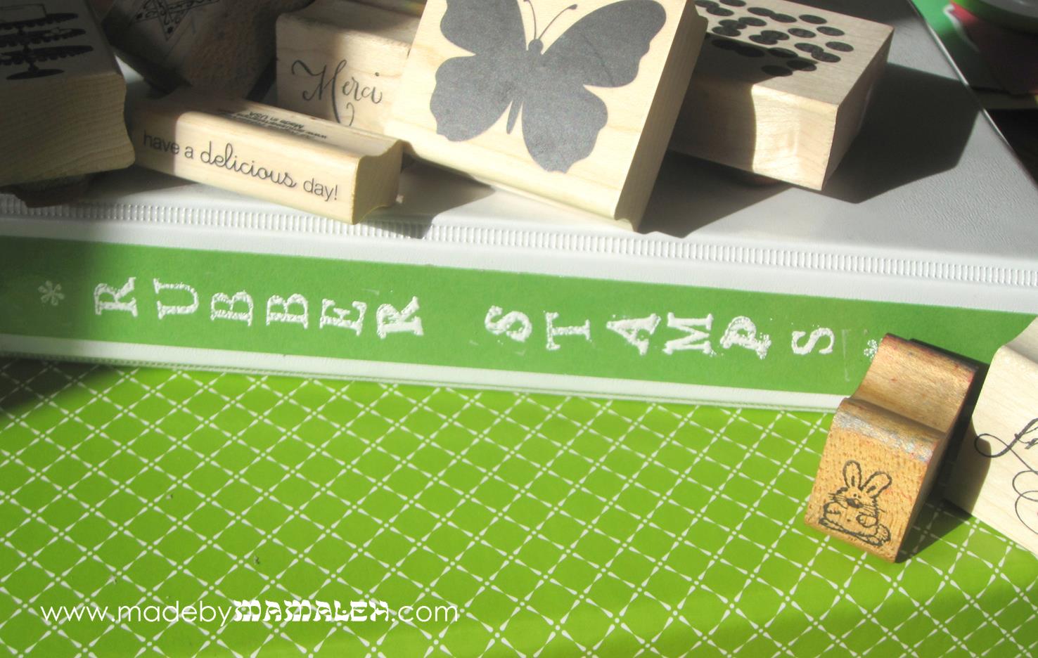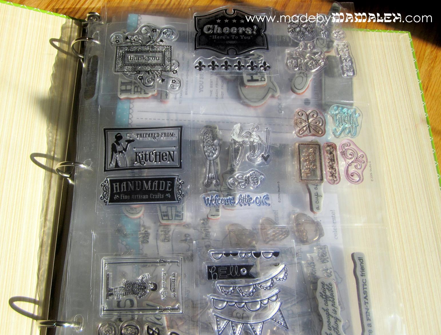 The steel drawers help with all of my wood-mounted rubber stamps, but in this era, I certainly have my share of clear and cling stamps as well. I store these types of stamps in a series of cute binders using either baseball card sheet protectors for the smallest ones, 5×7 sheet protectors for medium ones and full size sheet protectors for the rest.