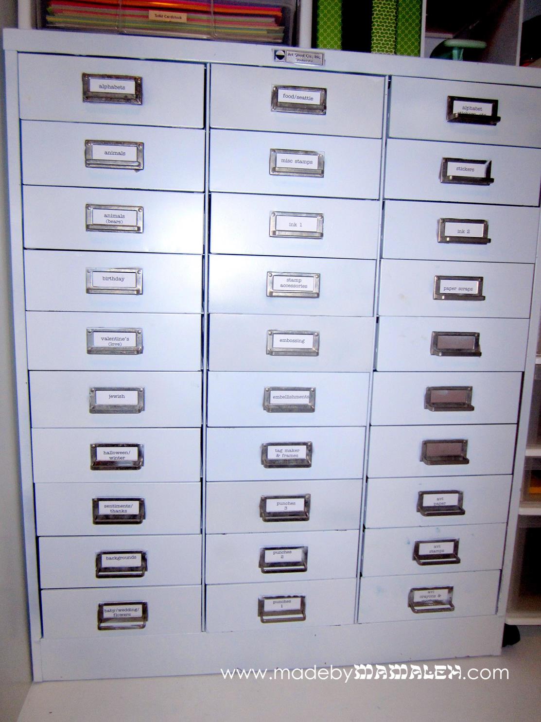 When I first started stamping as a child, my collection of stamps fit nicely in a shoebox but now I am sort of embarrassed to admit the amount of real estate they take up in my craft room. I was lucky enough to inherit the same steel drawer unit my grandmother used to store her stamps which is now home to all my stamps and various stamping accessories. It’s one of those things that makes you say “they don’t make ’em like they used to” with its sturdy (i.e. insanely heavy) steel frame and 30 little drawers. The original color was “industrial office furniture putty” which you can still see showing through where I have yet to put labels. The bulk of it I spray painted to go along with my white and green craft room. If/when my craft room is tidy, I still owe you a tour.