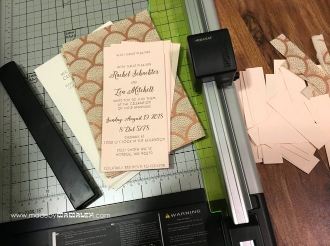 Working from an A9 (5.5″ by 8.5″ or a half sheet), I used Luxe White Cardstock for a base (and printed RSVP details on the back for single card simplicity). Then, using my heavy duty large scale paper cutter, I was able to cut 9 A9-sized pieces from each large sheet the Nepalese paper. I think A9 is an elegant size for wedding invites, especially where you are not including separate inserts for RSVP, etc. Once cut, I adhered these to the front of each invite using a tape runner and then trimming as needed.