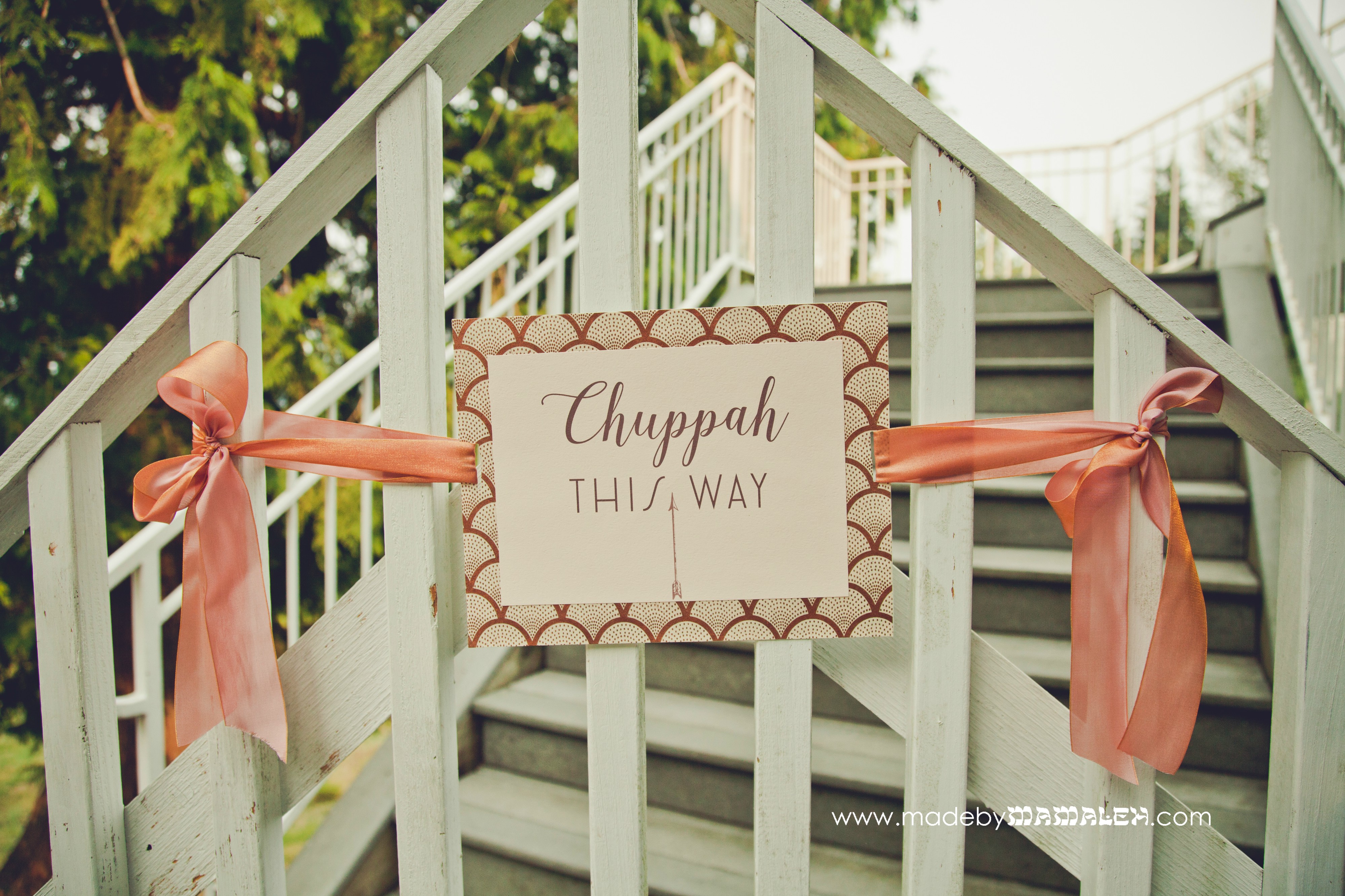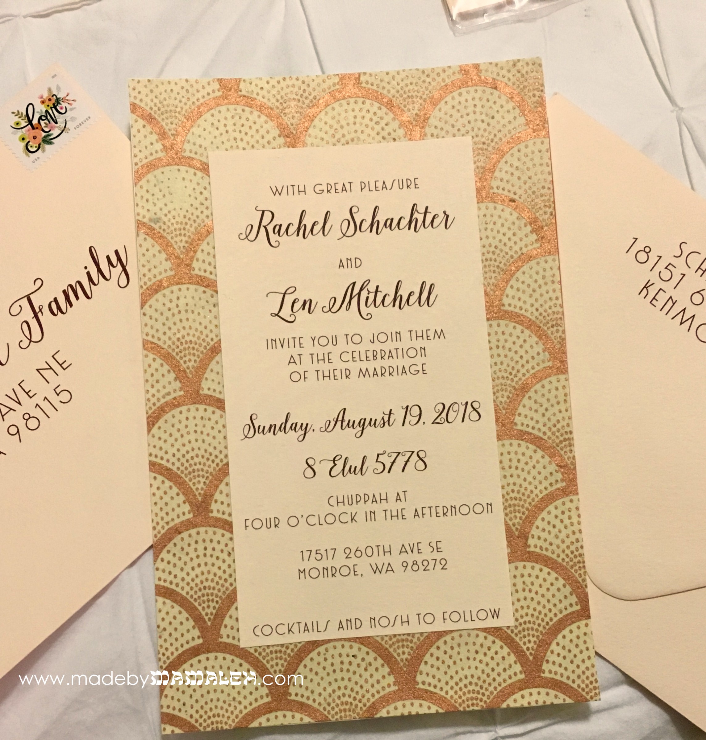 For the invite wording itself, I created a template in Microsoft Publisher that would allow for as much of the scalloped paper to show through while still providing plenty of room to write – so the printed area was 3.5×6.5 to allow a full inch all the way around. I printed this on the 60 lb. weight of the Luxe Blush in a deep brown color (RGB = Red 93, Green 45, Blue 52) using Isabella and Core Deco fonts (I somehow managed to get Core Deco for a super reduced price so keep your eye out for a deal). The combo worked perfectly and I used it for addressing the A9 Luxe Blush Envelopes too and then finished it all off with the perfect postage stamp (since amazingly this weighed in at just within single stamp range)! Mamaleh tip: we were able to stick to the theme of the wedding while still adding a few Jewish touches by noting the Hebrew date in addition to the secular one, noting time for the chuppah instead of just saying ceremony and use of the yiddish word “nosh“.