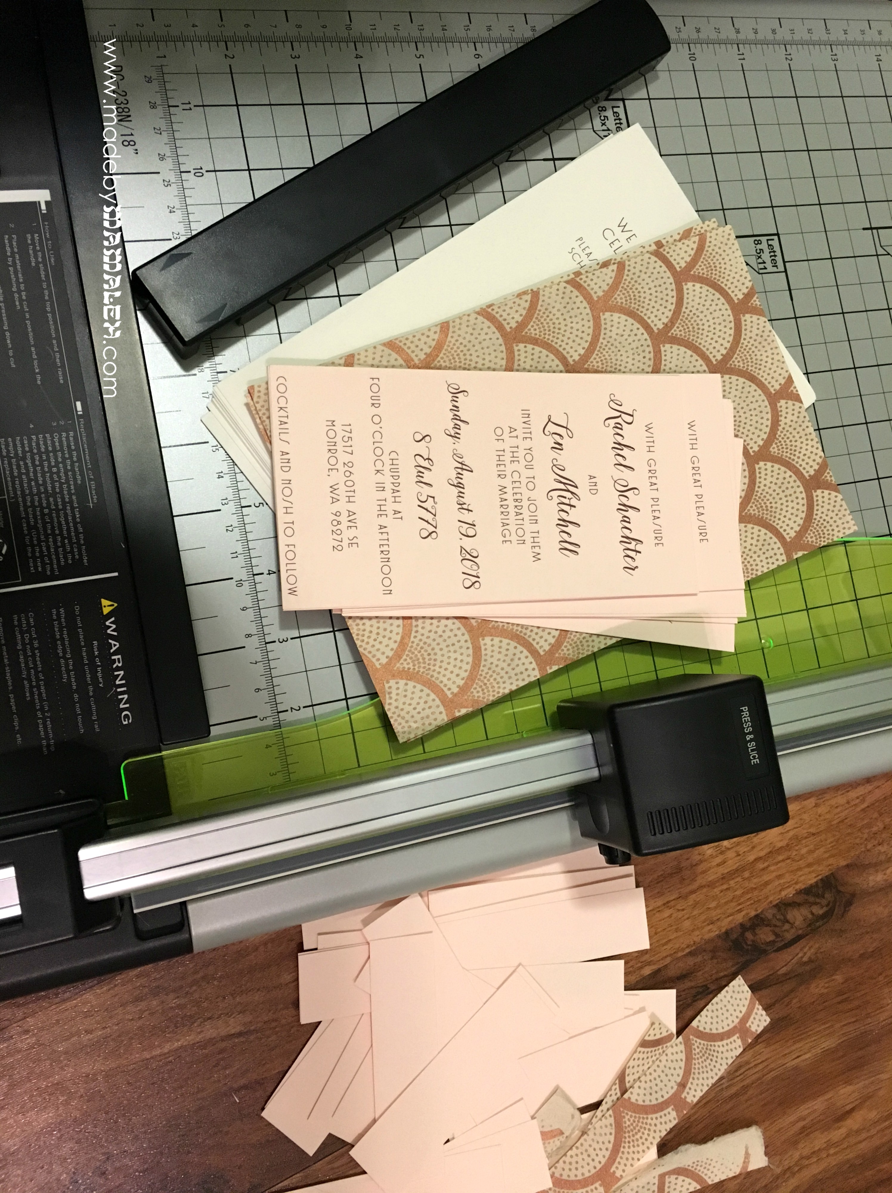 Working from an A9 (5.5″ by 8.5″ or a half sheet), I used Luxe White Cardstock for a base (and printed RSVP details on the back for single card simplicity). Then, using my heavy duty large scale paper cutter, I was able to cut 9 A9-sized pieces from each large sheet the Nepalese paper. I think A9 is an elegant size for wedding invites, especially where you are not including separate inserts for RSVP, etc. Once cut, I adhered these to the front of each invite using a tape runner and then trimming as needed.