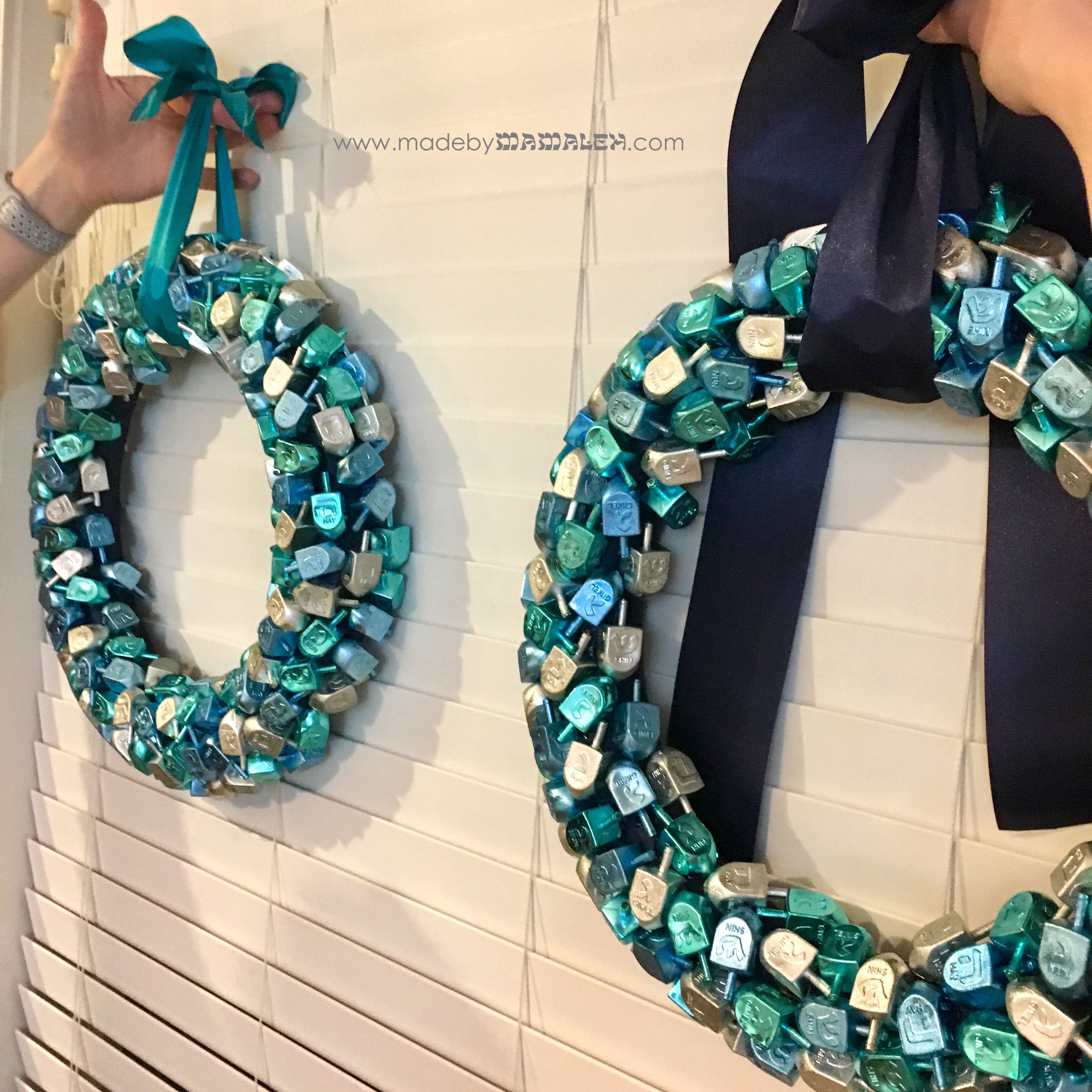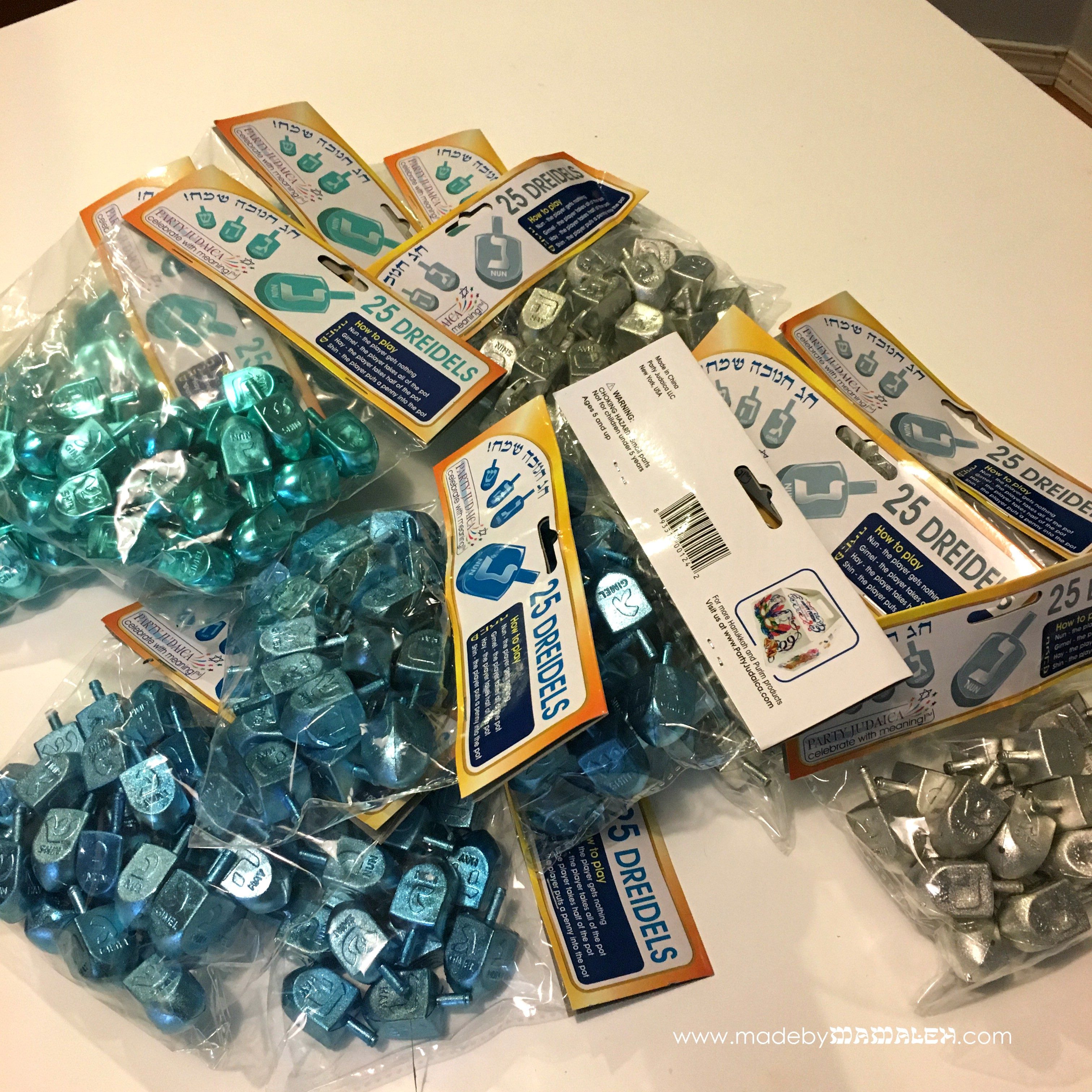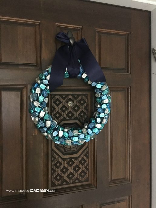 So, next I turned to a Pinterest search and came across this fabulous tutorial by Felt So Cute (clearly a Jewish crafting soul sister!!) from 2014. My friend KaraAnne and I took one look at this gorgeous wreath and knew we both needed it. Following the tutorial from Felt So Cute, we ordered a total of 300 dreidels (100 each of blue, ocean blue, and silver; a total of 150 for each of us) from chocolategelt.com. (I also ordered some blue and silver gelt to go in the jar on my mantle for festive Hanukkah sweets – the order came quickly and I would definitely order again!) To be fair, the dreidels add up even on sale (just under $50 for each of us) but we both agreed it was totally worth it since there are no pre-made wreaths that even come close to this beauty and this will last for many years to come!