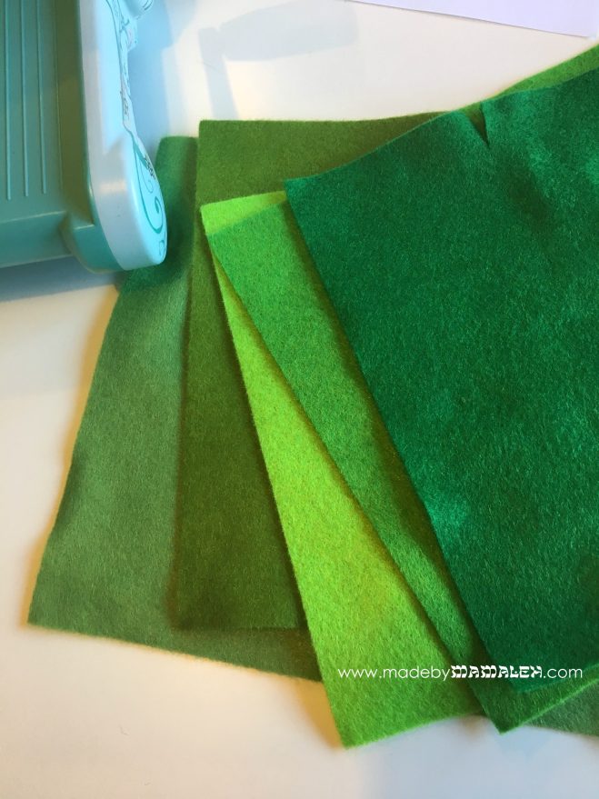 For this wreath, I once again had a good crafting sesh with one of my besties. We started with a couple of grapevine wreaths for that tree look we were going for. Next, we picked an array of green felt in various hues from this felt multipack. Using a big leaf die that cuts out two sizes of leaves, we ran it through the Big Shot, cutting each color using the full die and then just the smaller leaves two more times. So, in the end we each ended up with one large leaf of each color and three smaller leaves of each. Of course, you could use whatever sort of combination that you wanted to create whatever your tree vision might be.