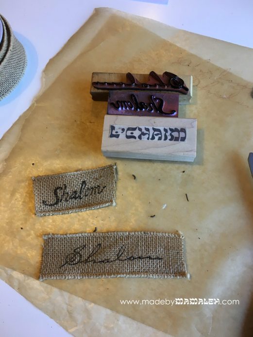 Next, using wired burlap ribbon, we created a “banner” to be applied across the width of the wreath. My original plan was to stamp a sentiment using fabric ink. I tried this with a couple of different sentiment stamps and ink colors and it just did not look right as it did not fit the boldness of the design.