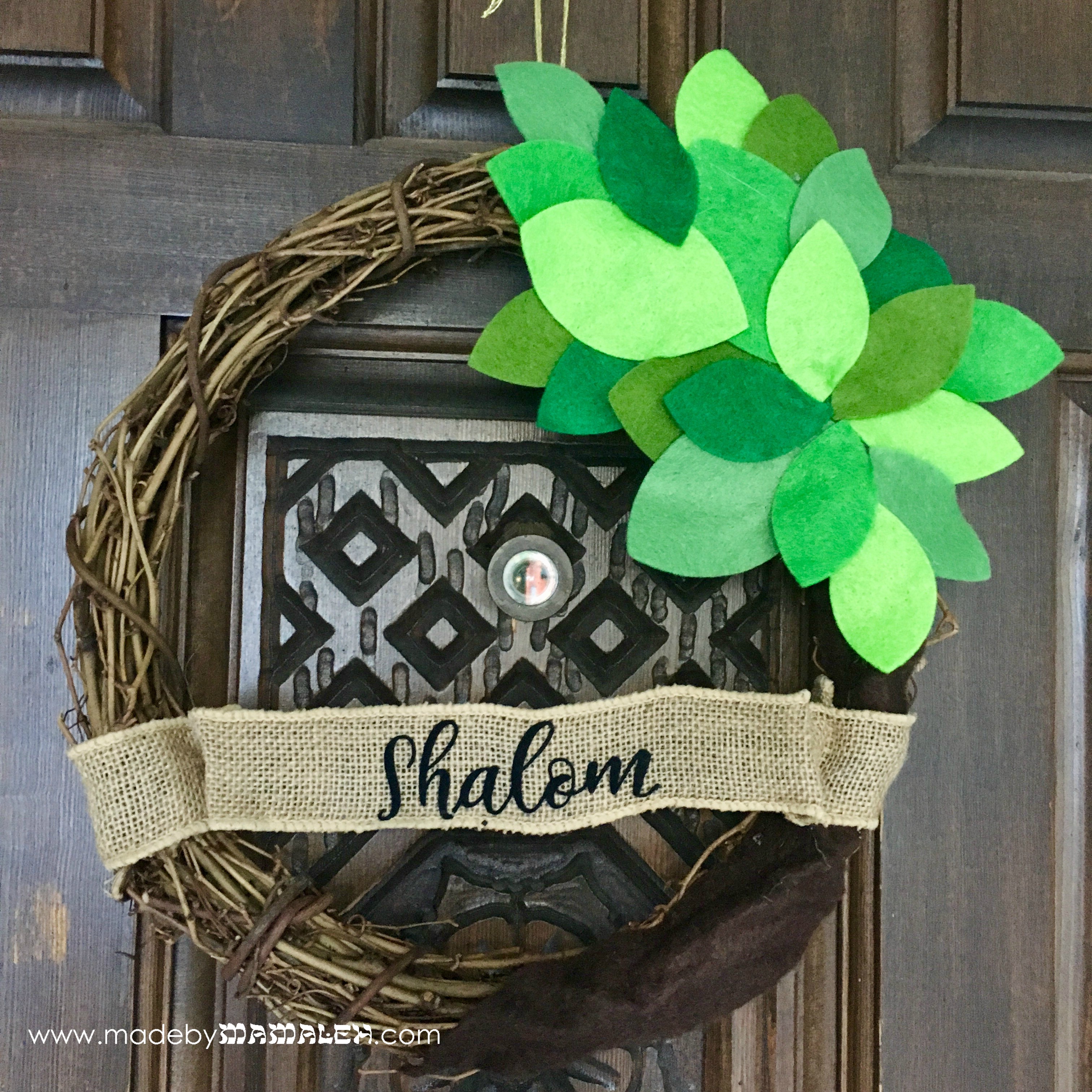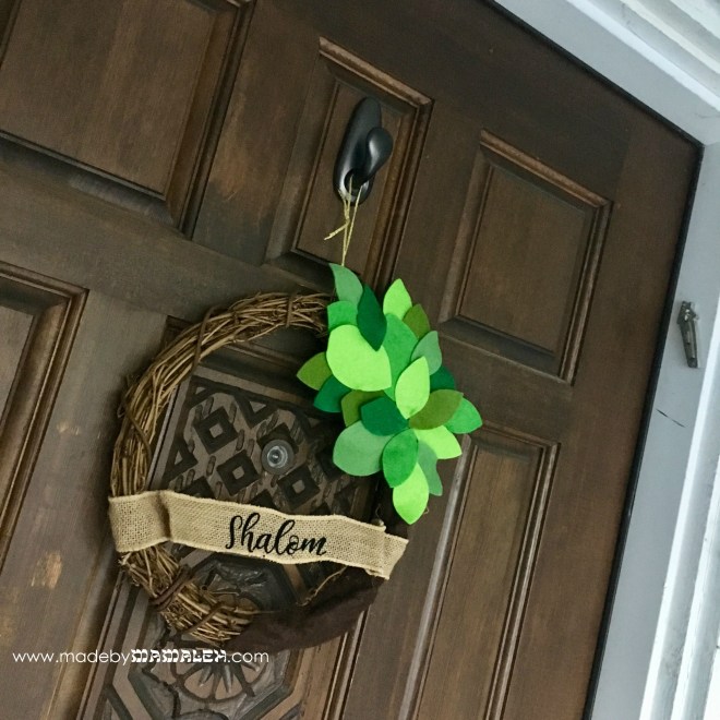 So, back to the drawing board, we decided to cut out the word “Shalom” from flocked iron-on vinyl using my Silhouette Cameo and then ironed it on the ribbon. This worked much better! Using this method, you could even choose to write in Hebrew. After ironing-on Shalom, we then wrapped the ends around the wreath and then held them in place with hot glue. After attaching a little gold twine hanger, up on the door it went and I couldn’t be happier with it! Happy Tu B’Shevat!
