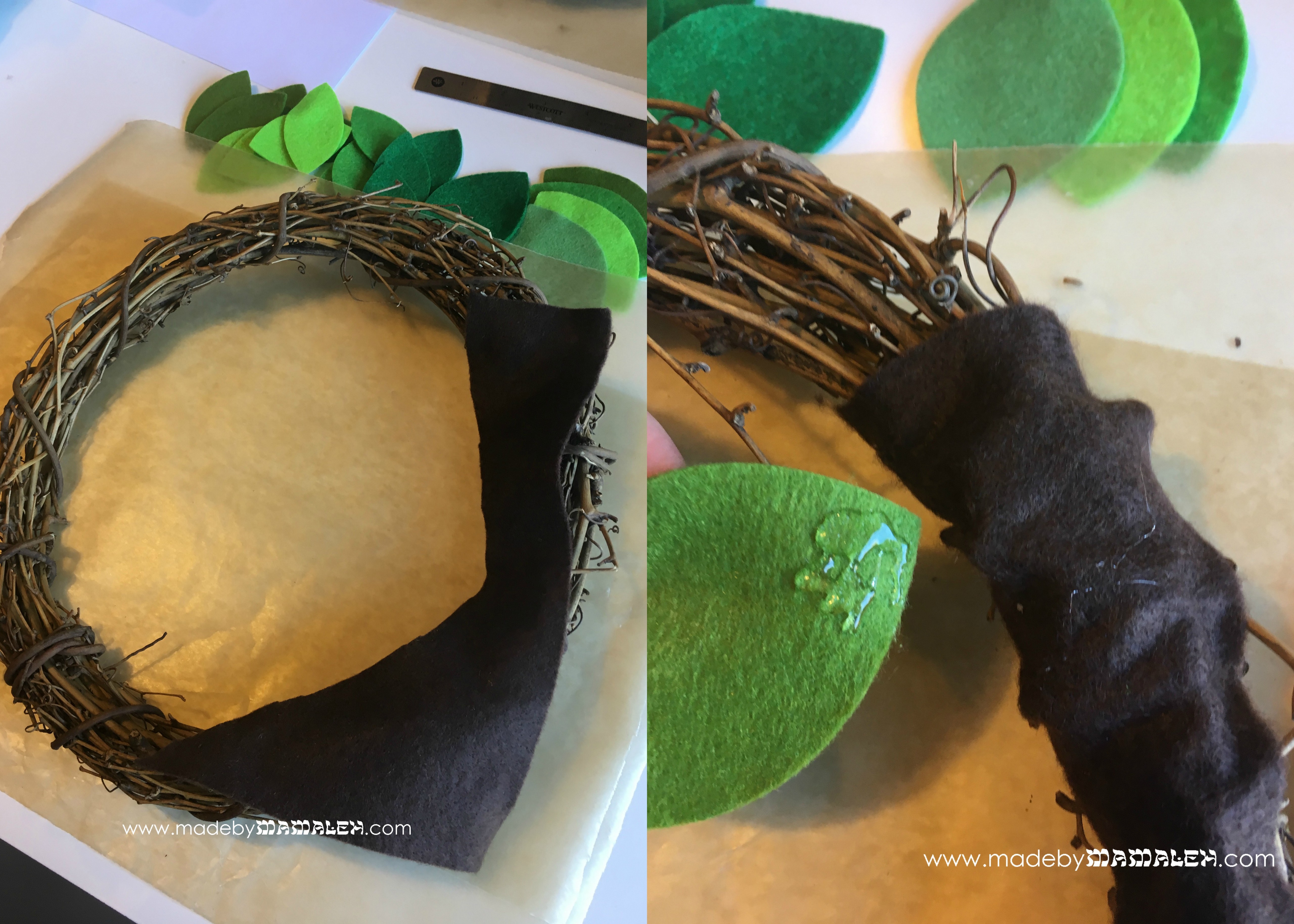 After the leaves were cut, we free-handed a “trunk” out of one of the sheets of dark brown felt. Next, we were ready to glue. Because the grapevine wreath has so many openings between the branches, we were sure to put down some wax paper before starting the gluing process. Using hot glue guns, we first glued down the trunk, pressing it into the wreath on one side. Then, working leaf by leaf, putting glue only on the bottom corner so as to leave the tops free, we arranged our leaves to form a tree.