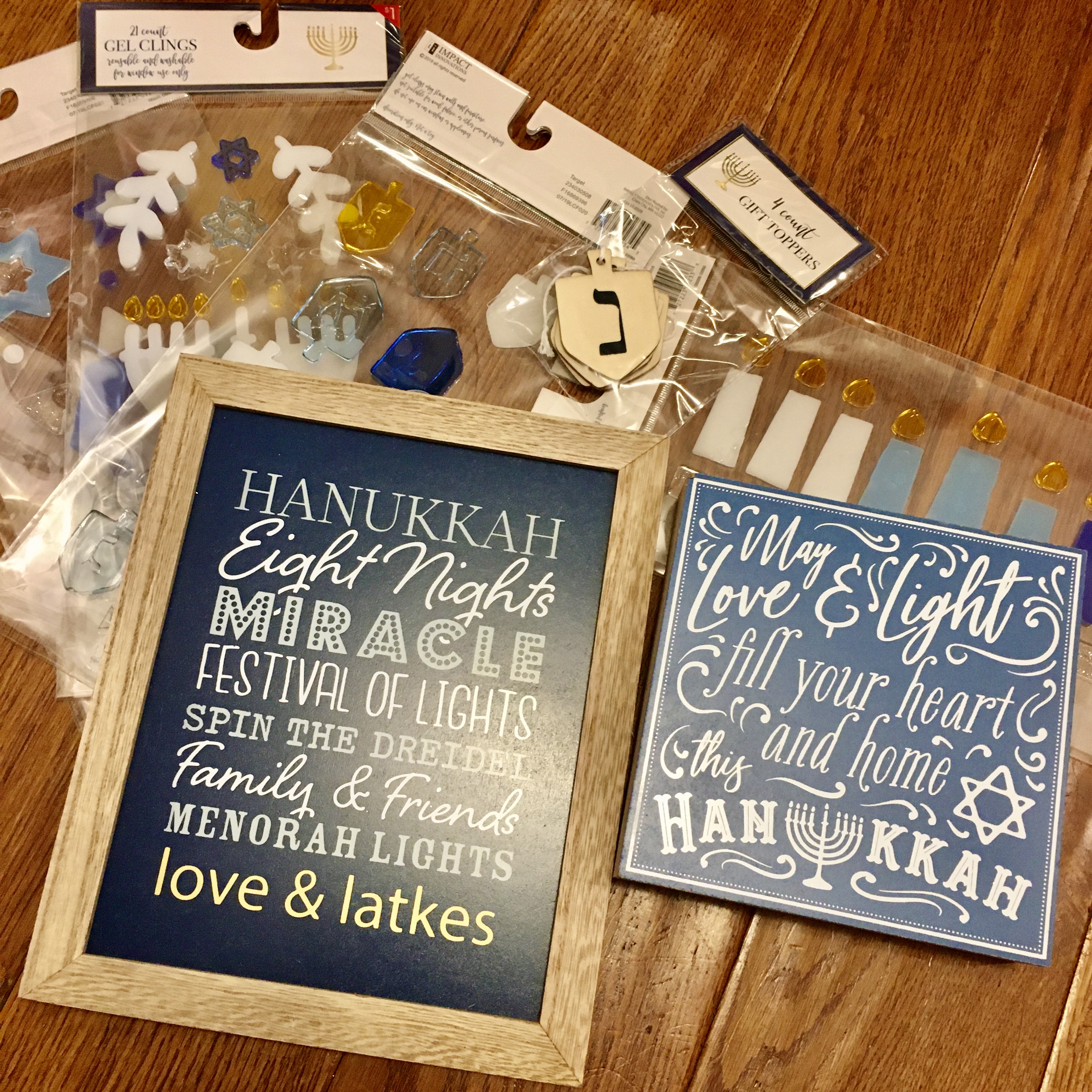 I always manage to find some good stuff here and it’s never shown online so the best thing to do is go to your store and look. You can see my finds yesterday above – a couple of cute wooden signs, some wooden dreidel tags and of course some window clings for my daughter.