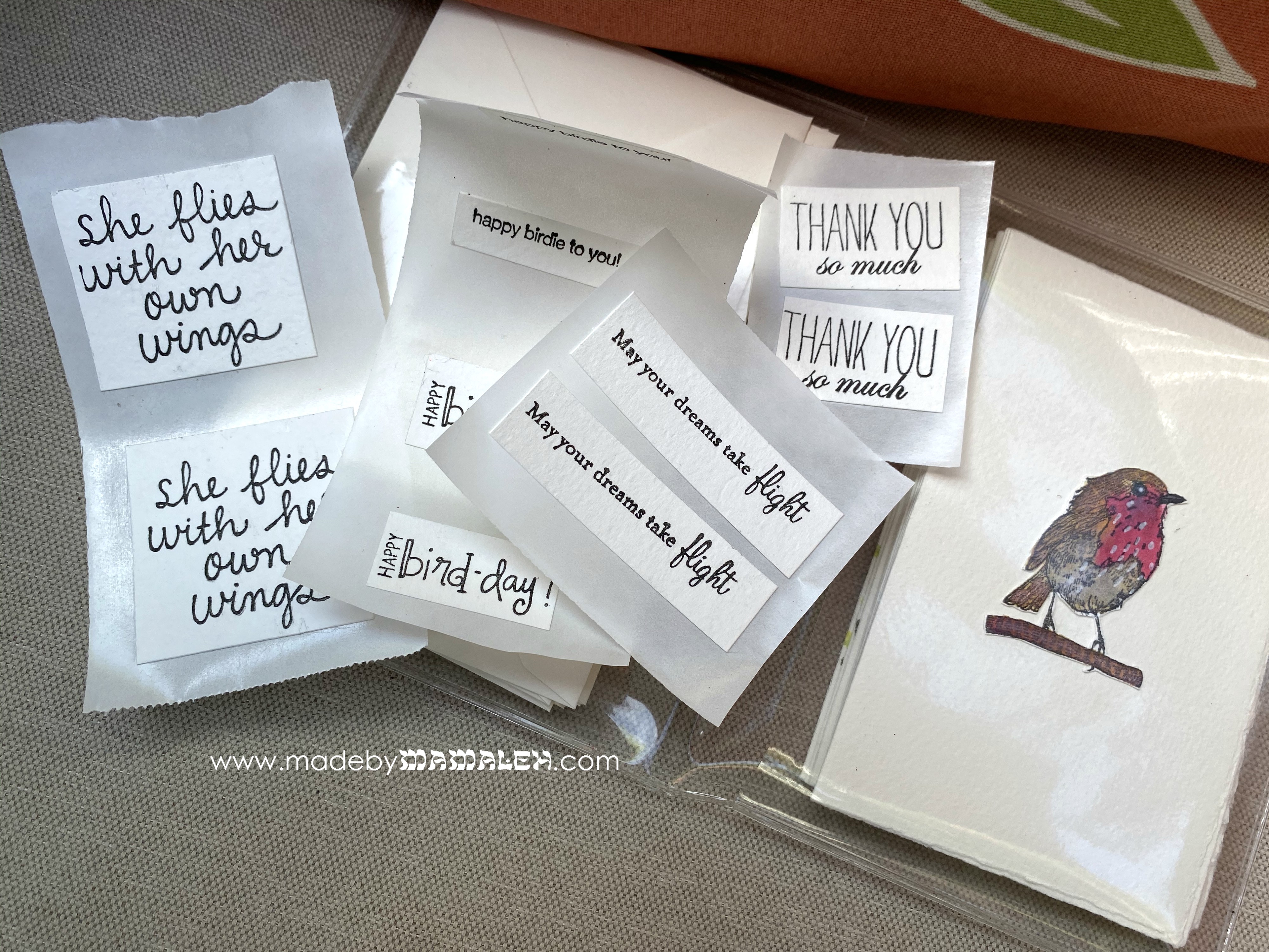 Now, once the cards were done, I was quite happy with the result but sort of wanted to do some sentiments. I considered just designating some thank you notes (which everyone should always have a stash of to give old school thanks) but wanted to do something that gave my mom a bit more a choice. And, then it came to me – choose your own sentiment! It’s like a Choose Your Own Adventure Book (anyone else remember reading those as a kid?!) but for handcrafted cards! It’s also a great way to create a really user-friendly gift. So, I picked out a handful of sentiments, several with a nod to the bird theme and stamped them on a lighter weight cardstock that roughly matched my card base – I forgot to write it down but pretty sure I used Luxe White Paper from PaperSource. Then, I cut out each sentiment into a small size and turned them into stickers using my Xyron Create-A-Sticker. The beauty of this is that the Xyron creates the stickers on backing so then they can just be tucked in with the cards just like stickers you’d buy and the recipient, in this case my mom, can use them if/when she wants.