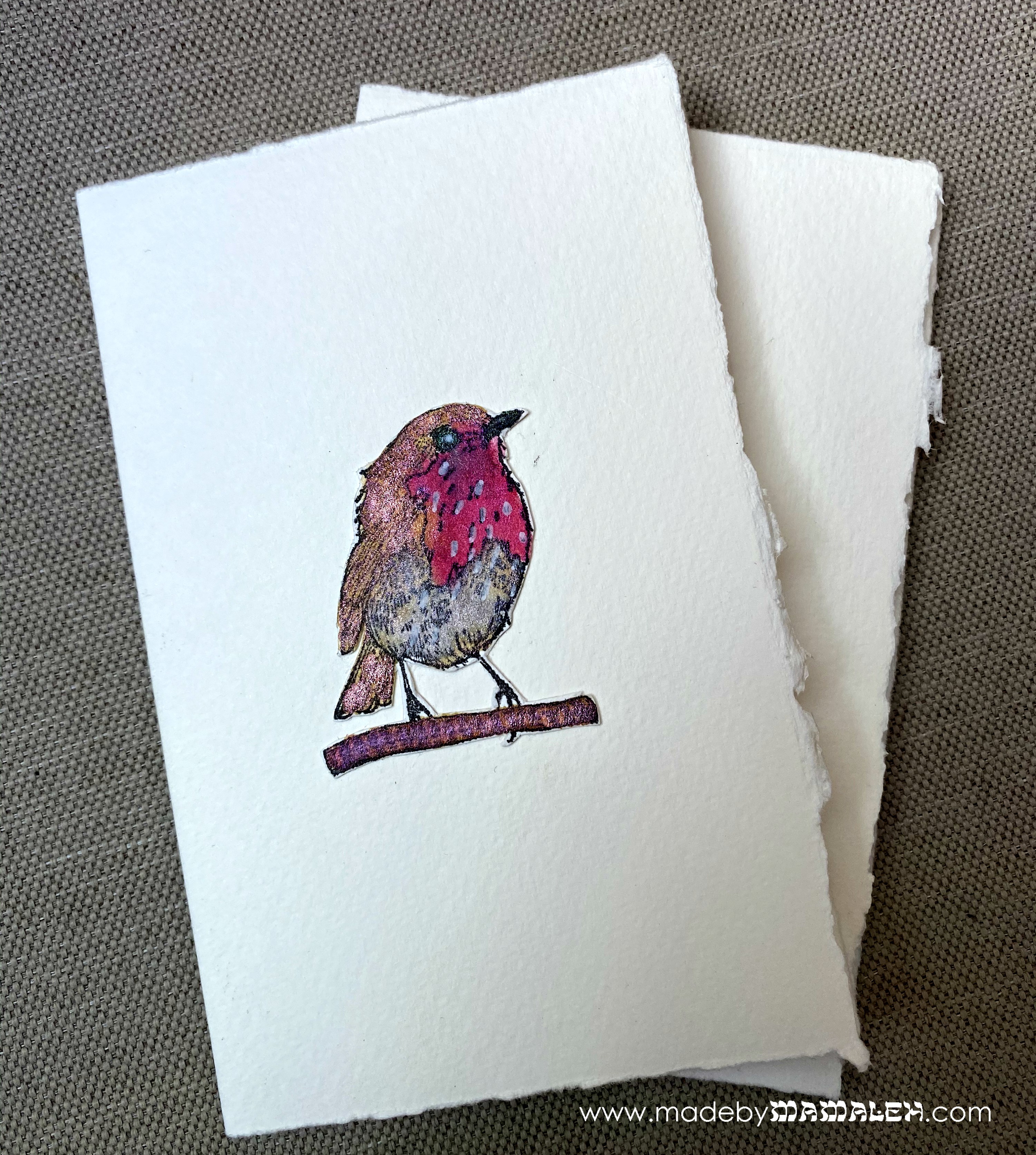 Hero Arts Robin stamped on watercolor paper and then painted with Twinkling H2Os. White accents made with white Pitt pen . Then cut out and attached to card.