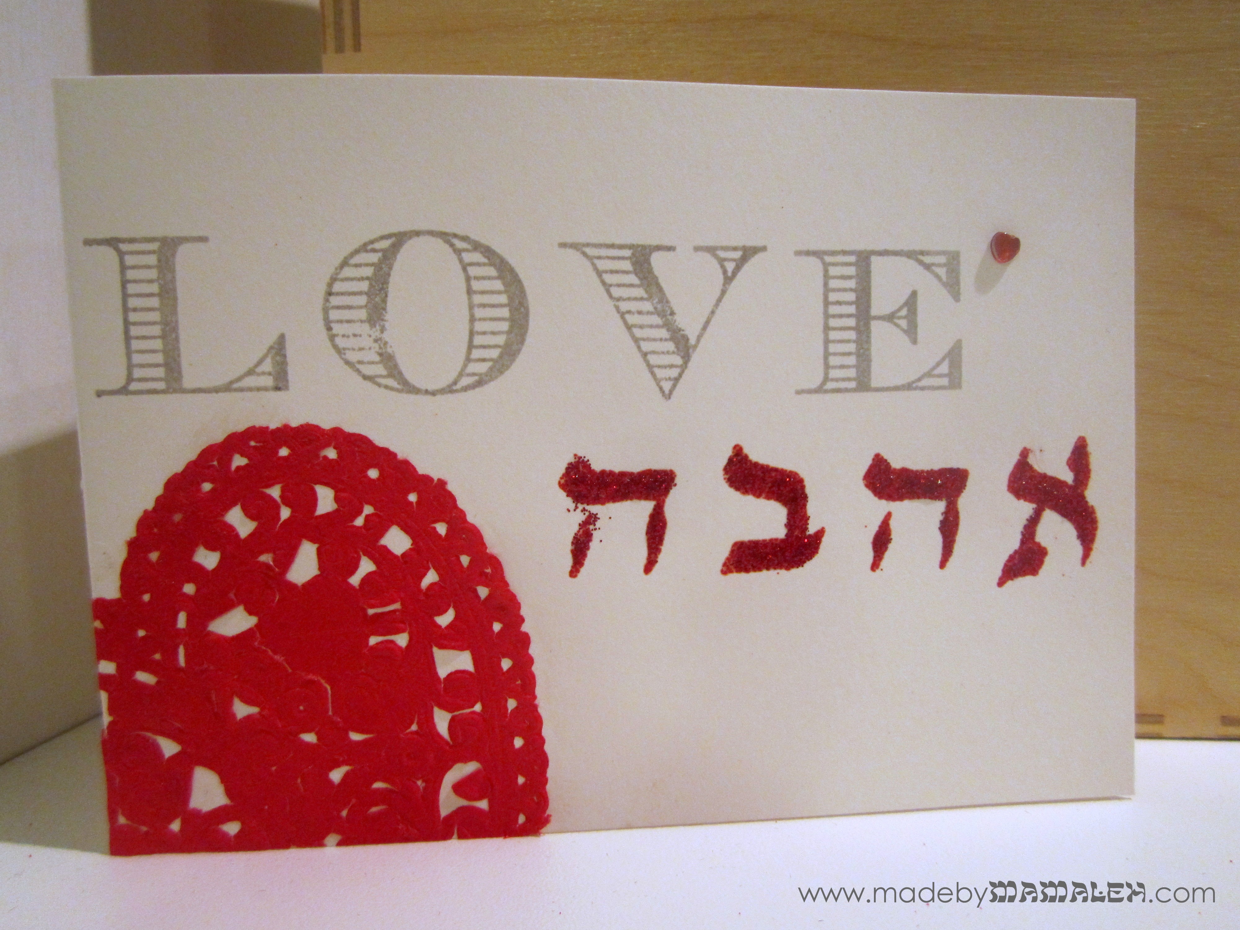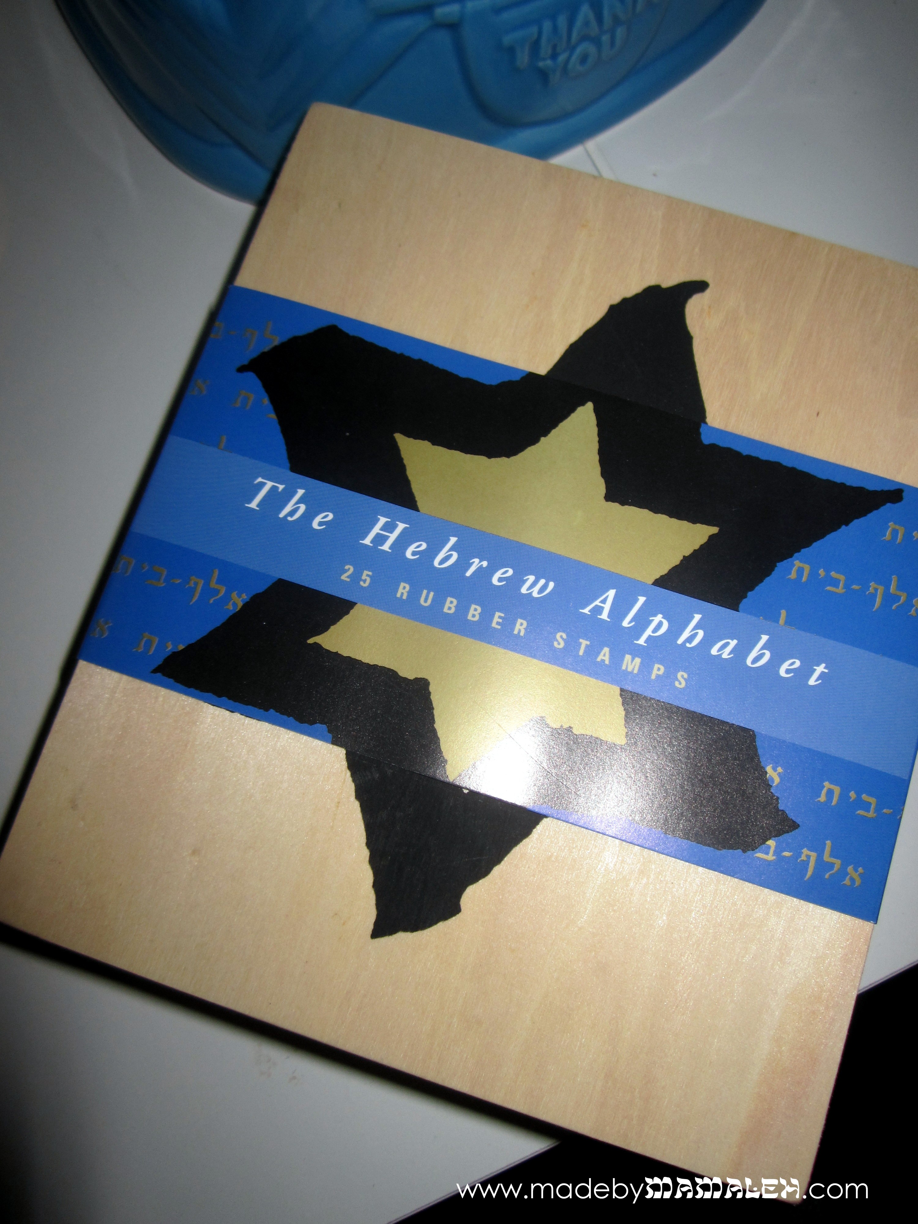 As I mentioned in last week’s post, take it or leave it, I love Valentine’s Day. I think it’s a great excuse to remind people you care about them and of course yet another time to break out the card-making supplies. Kveller had a fantastic piece yesterday: Should Jews Celebrate Valentine’s Day?. If you want more intellectual food for thought, check it out. Today I wanted to share with you my attempt at adding a Jewish twist in this year’s homemade Valentine’s cards by incorporating some Hebrew. Now, I have to tell you, I LOVE alphabet stamps! I have too many sets to admit in writing. But, Hebrew alphabets are a totally different story than English ones and nearly impossible to find in rubber stamp form. So, I have been on the hunt for quite a while and was very pleased to luck out and get this now out of production set still shrink wrapped on eBay complete with book and packaged in a wood box.